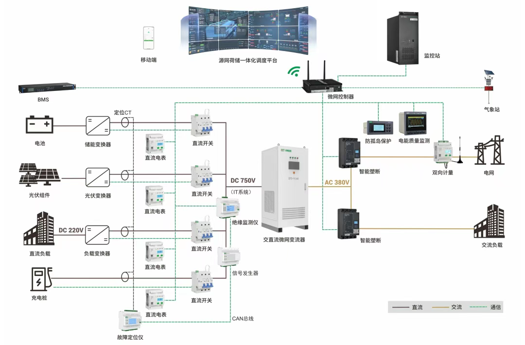通過搭建光儲(chǔ)直柔綜合管理控制系統(tǒng)可監(jiān)視系統(tǒng)內(nèi)光伏、儲(chǔ)能、各類交直流負(fù)荷,通過單雙向變換器以及雙向變流器將交直流系統(tǒng)進(jìn)行互聯(lián),通過自動(dòng)控制策略自主進(jìn)行柔性調(diào)節(jié)保證系統(tǒng)的安全穩(wěn)定運(yùn)行,充分發(fā)揮系統(tǒng)柔性,使建筑從電能的“消費(fèi)者”轉(zhuǎn)變?yōu)?ldquo;供能者”,為園區(qū)建筑、高速服務(wù)區(qū)建筑等場景提供先進(jìn)的光儲(chǔ)直柔系統(tǒng)解決方案。