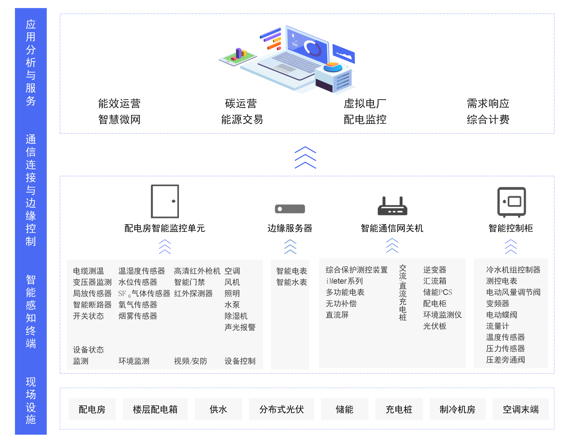 CET智慧園區(qū)數(shù)字化能源云平臺采用“云大物移智鏈”等技術(shù),通過智能網(wǎng)關(guān)以及邊緣控制服務(wù)器將現(xiàn)場設(shè)備數(shù)據(jù)上傳至平臺,基于穩(wěn)固的數(shù)字底座構(gòu)建豐富的業(yè)務(wù)應(yīng)用體系。可提供能效運營、智能微電網(wǎng)、需求側(cè)響應(yīng)、購售電一體化、配電及綜合計費、中央空調(diào)節(jié)能管理等多種服務(wù)。