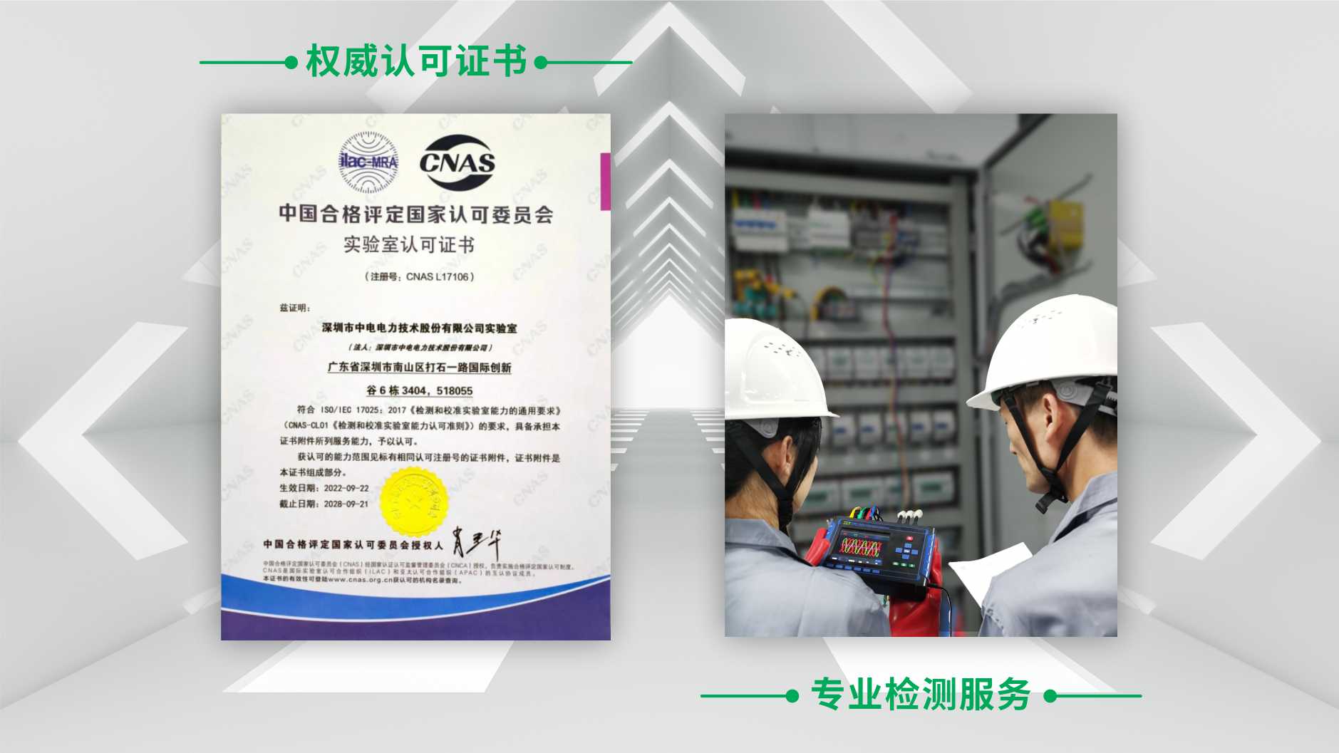 深圳市中電電力技術股份有限公司實驗室是供配電系統(tǒng)電能質量檢測專業(yè)實驗室。實驗室擁有由多名現(xiàn)場經(jīng)驗豐富的電能質量工程師組成的專業(yè)檢測團隊,經(jīng)中國合格評定國家認可委員會批準,正式獲得CNAS實驗室認可證書,可為客戶出具具有國際互認性、權威性和公信力的檢測報告。